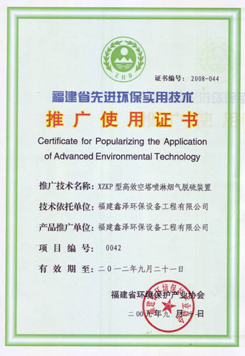 福建省先进环保实用技术推广使用证书(XZKP)