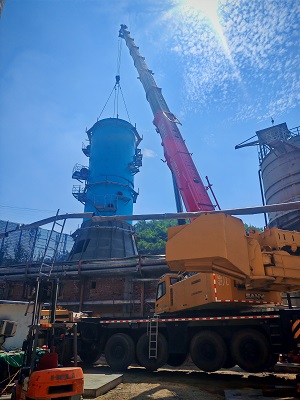 由我公司中标承建的山西***循环流化床锅炉新建湿法脱硫系统工程,目前脱硫塔吊装至喷淋段标高+29.5m处;除雾段、上锥段正在分段拼装;同时在预制烟道。